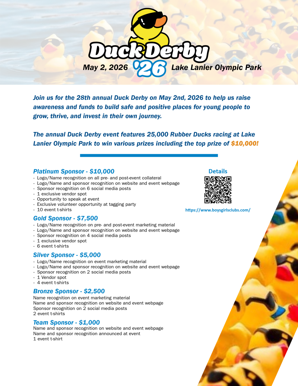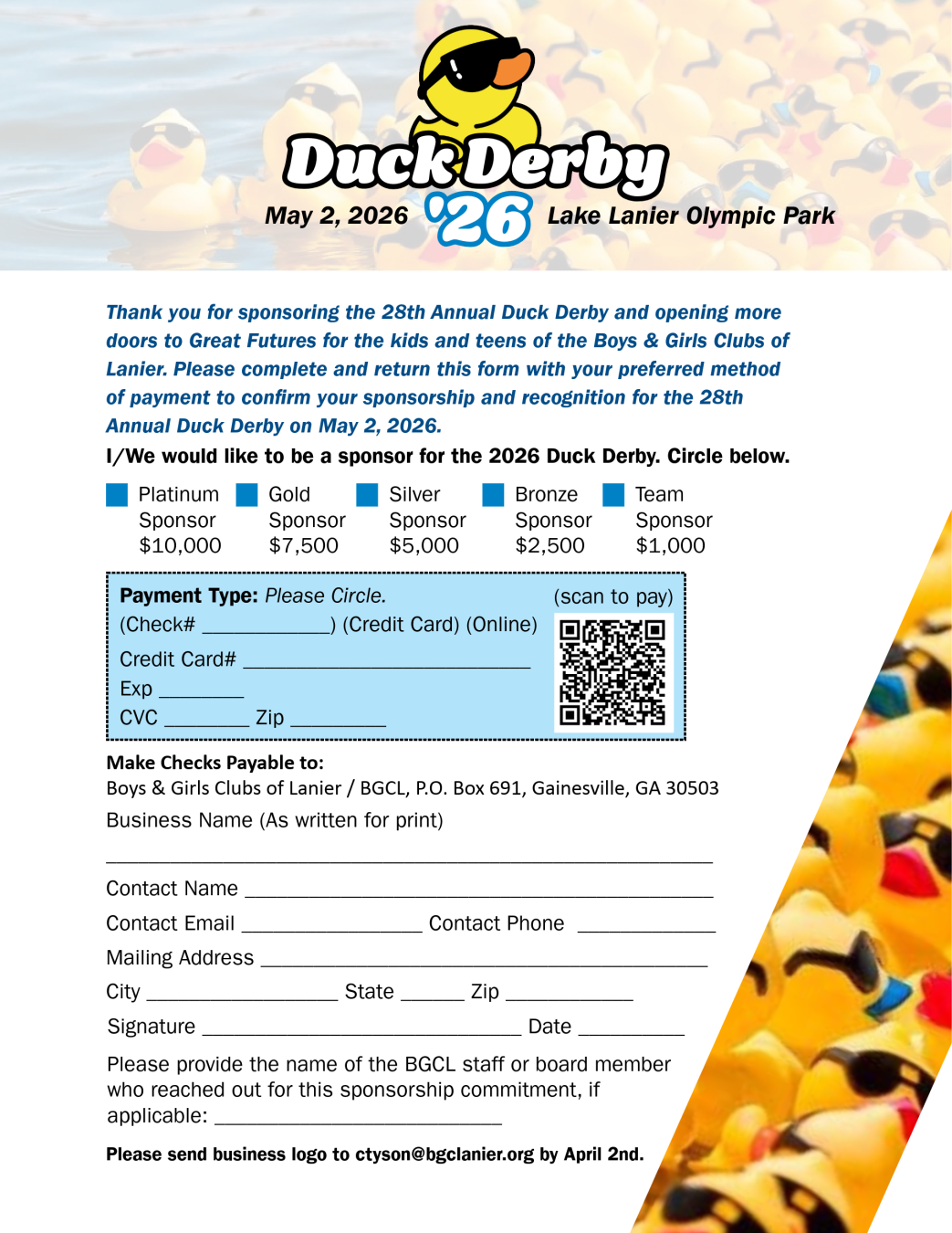 Introduce and share your business or group with over 1,000 individuals as a 2026 Duck Derby Sponsor!