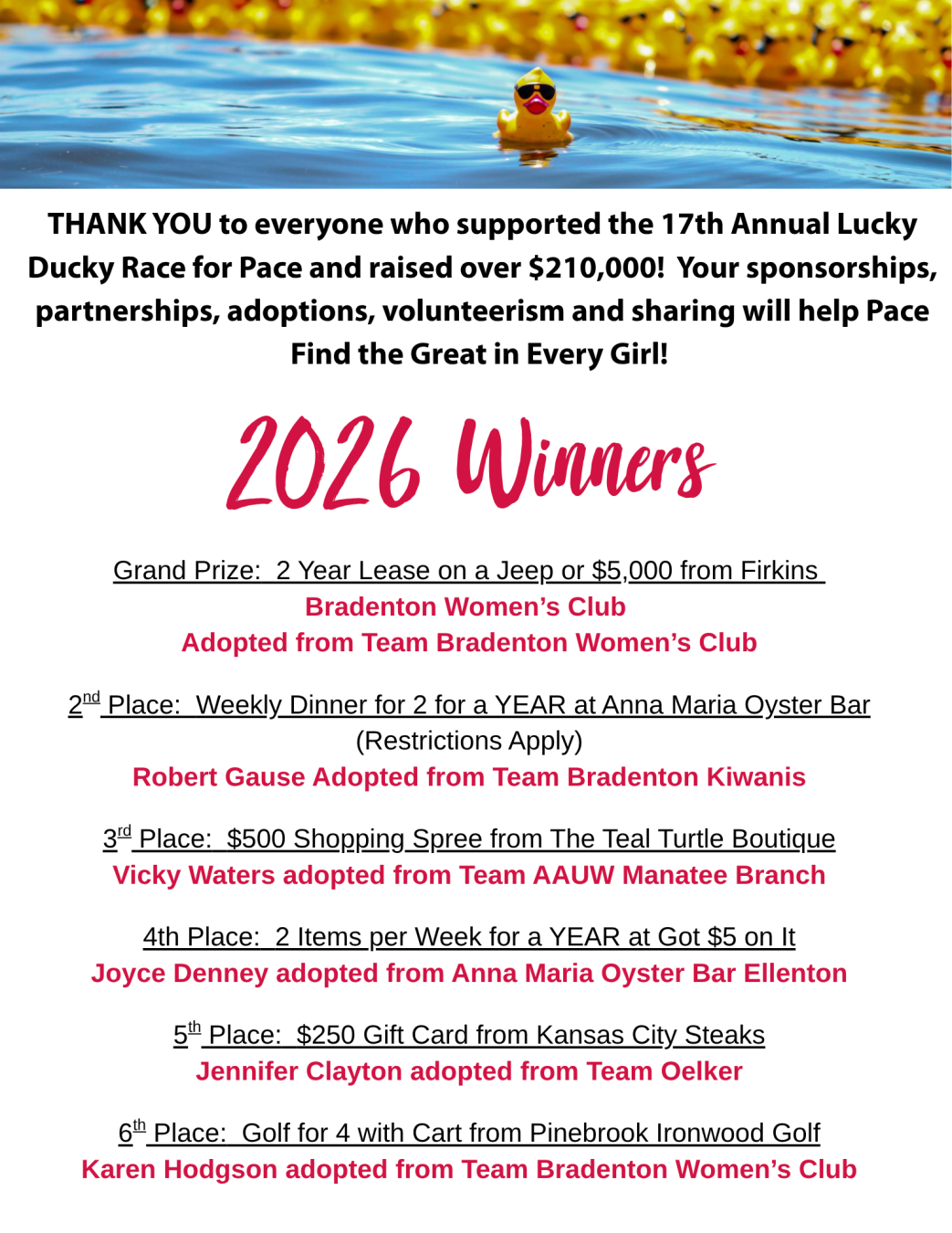 Of course, everybody loves Quacky and she is working hard to bring fun to Manatee County! However, as the primary fundraiser for Pace Center for Girls, the Lucky Ducky Race for Pace is really about changing the lives of girls in Manatee County. Pace values all girls and young women, believing each one deserves an opportunity to find her voice, achieve her potential and celebrate a life defined by responsibility, dignity, serenity and grace.